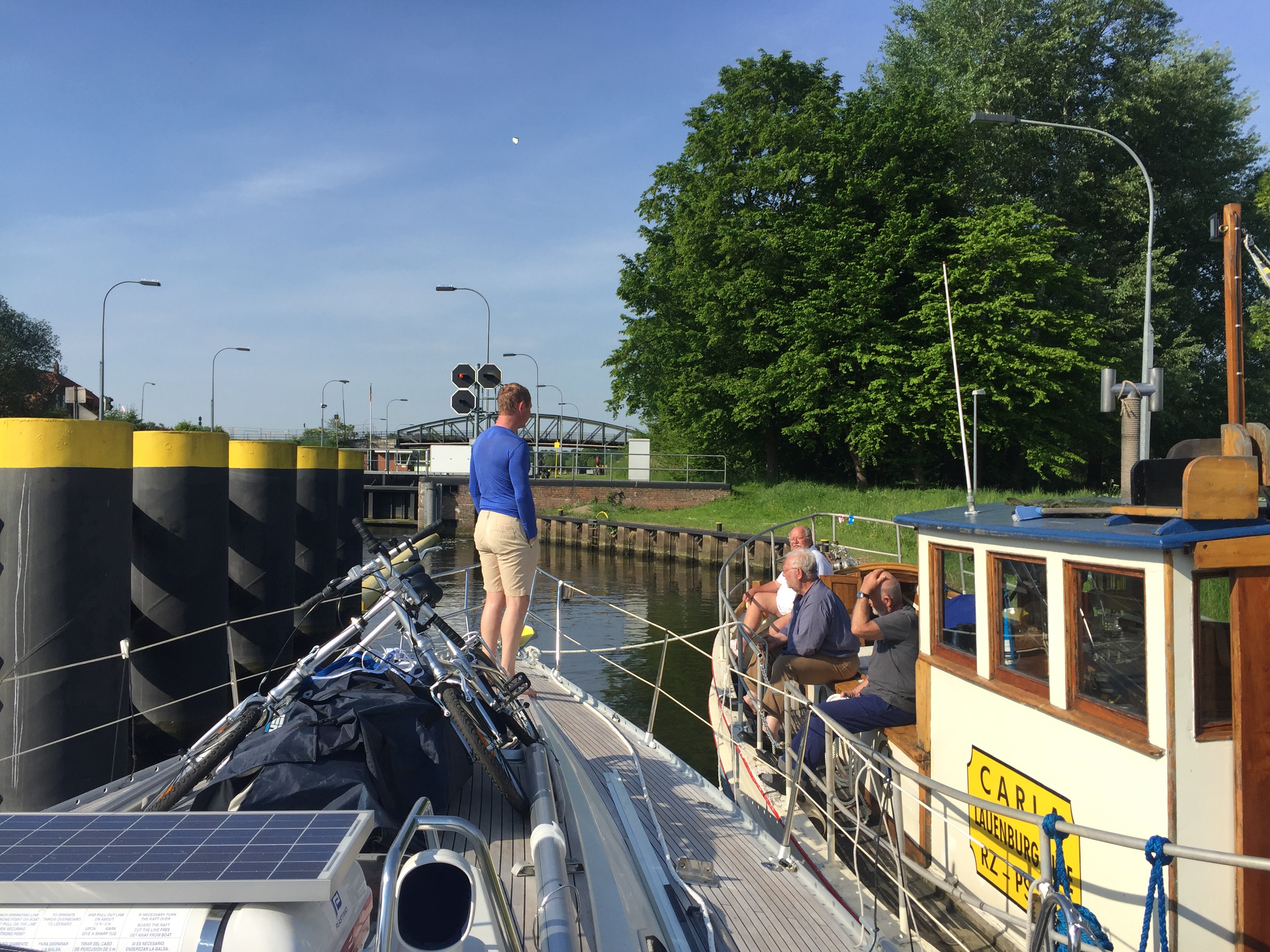 Nu börjar kanalresan på riktigt. Efter en kort färd på Trave kom vi in i Elbe-Lübeck-kanal. En ganska smal och glest trafikerad kanal som slingar sig genom landskapet. Fem slussar passerar vi på vägen till Lauenburg vid Elbe. Vid den första ligger det redan en tysk motorbåt med tre äldre gentlemän som vi pratar med i väntan på att slussen skall bli klar. De har hemmahamn i Lauenburg. Vi får en  massa bra information om hur man skall göra på kanalerna. Bland annat är det väldigt viktigt att inte köra för fort. 10 km/h gäller på denna kanal och vi får ett papper där det står angivet hur många minuter det skall ta mellan slussarna. Slussvakterna klockar båtarna och kommer man för tidigt får man böter. Det är inte mycket annan trafik i kanalen och det är bara vi två i slussarna.
