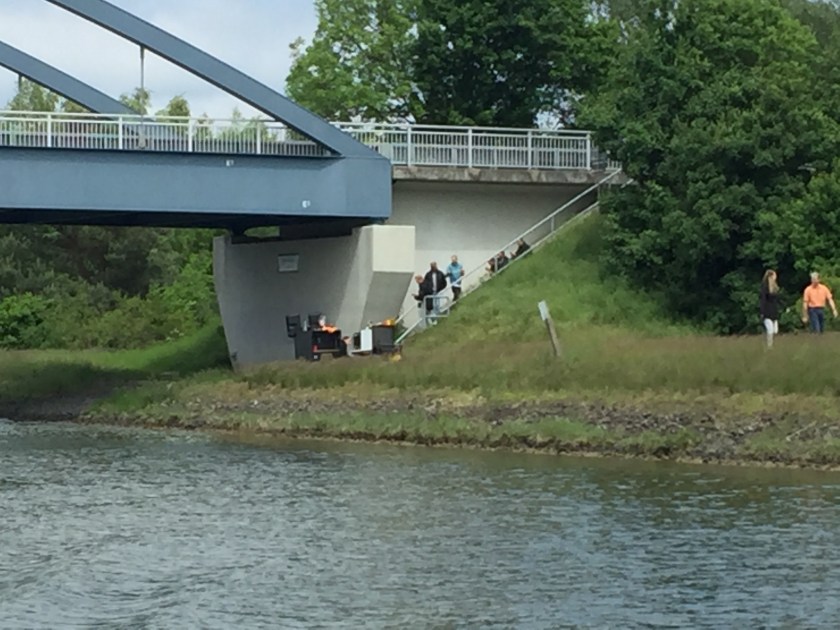 Kristi Himmerlsfärd och vi skall avverka sist biten av Elbe-Seitenkanal för att nå Mittellandkanal. Längs kanalen ser vi grupper av tyskar, oftast på cykel, och alltid med en öl i handen. En del sitter på kanalkanten, men de flesta verkar förflytta sig planlöst under ett livligt stojande. Efter ett tag förändras folklivet och det bli mer horder av unga tyska män. De har dragkärror med öl och ofta en grill. En del har stora musikanläggningar som pumpar ut tysk industrirock. För att driva dem har de små elverk på kärran. Ett gäng hade placerat sig under en bred motorvägsbro vilket gav en mäktig akustisk upplevelse när basen vridits upp till max. De flest verkar vara på mycket gott humör och tjoar glatt till oss andra förbipasserande, både på och bredvid kanalen. När vi kommer ut på Mittelandkanal ökar trafiken märkbart. Här är det betydligt fler fritidsbåtar och en strid ström med flodpråmar, kanalen är äldre och kanalkanten är mer beväxt, vilket ger ett skönt lä för den svala vinden.