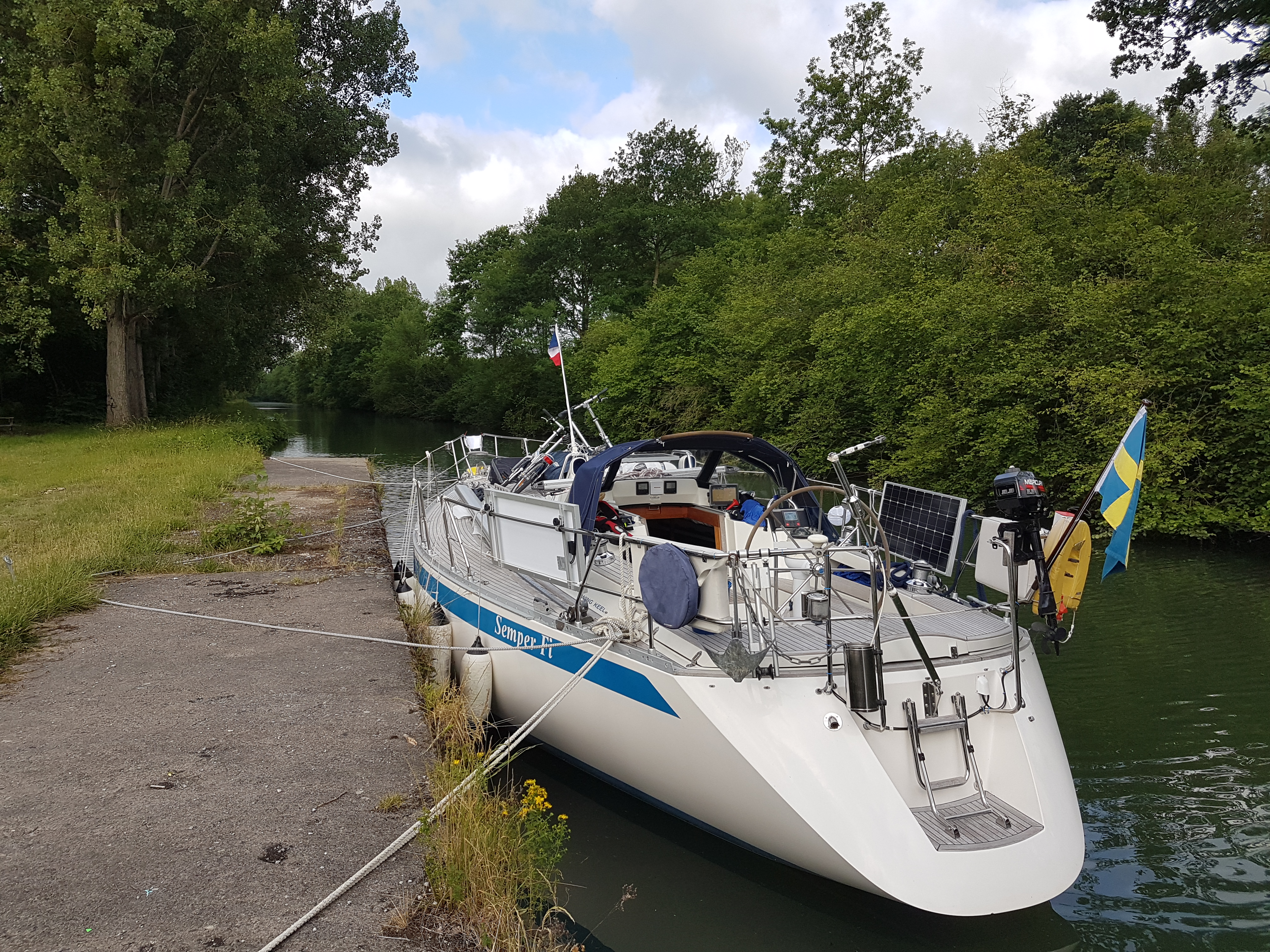 20170505_184716-2När vi sjösatte trodde vi att vi nästan var klara. Det var vi inte… På listan var då, förutom det man alltid måste göra efter sjösättning, nytt kutterstag med rullsystem, montera 2x100W solpaneler, installera AIS, byta ankare och ankarkätting, byta toapump, montera nytt gasolkök, bunkra mat, packa personliga tillhörigheter i huset så det kunde hyras ut, packa kläder och annat vi vill ha med oss i båten, fixa fenderplankor, städa hela båten innan allt packas in. Jag är lite tidsoptimist och underskattade tiden för en del arbete ganska rejält.