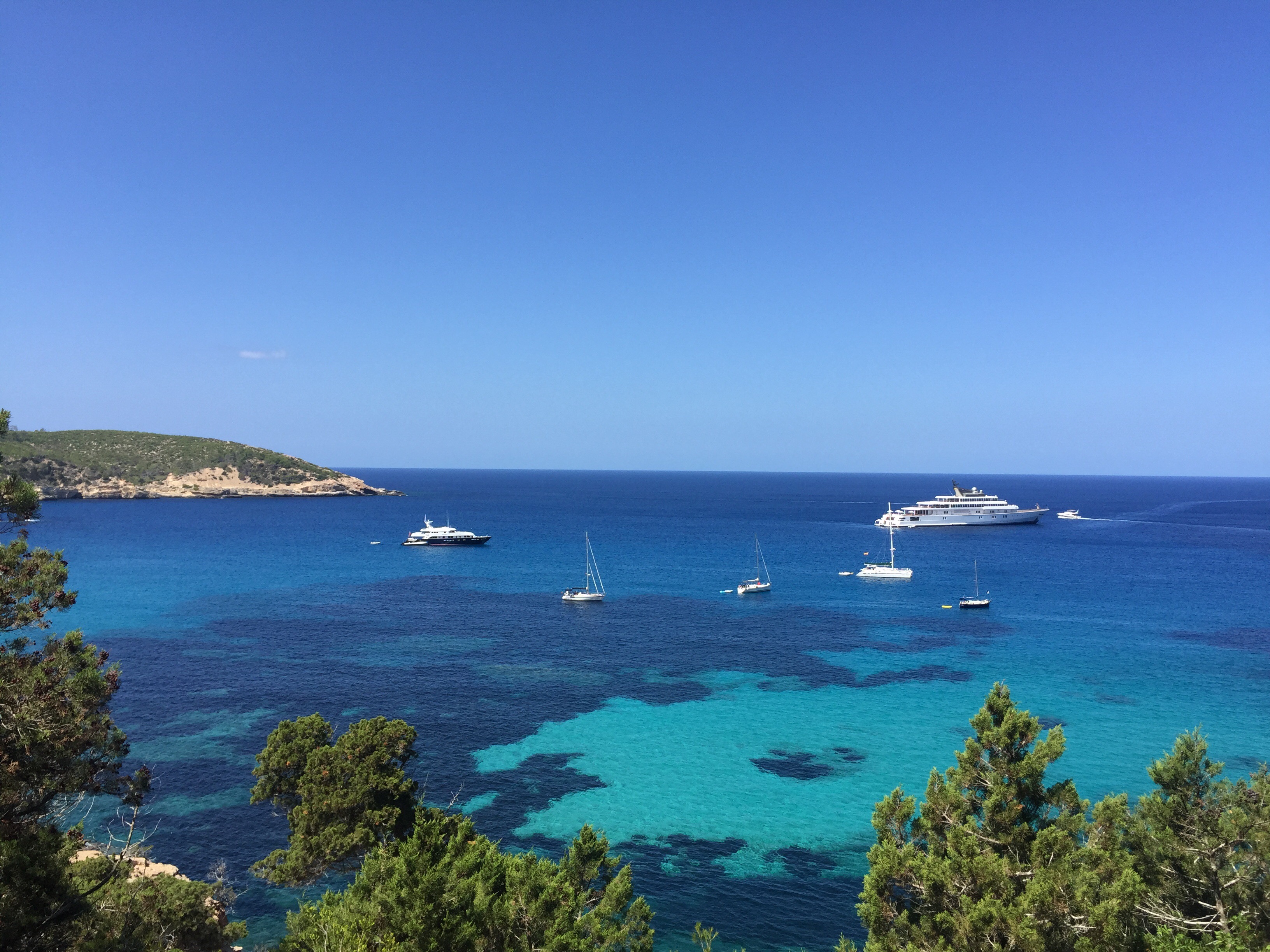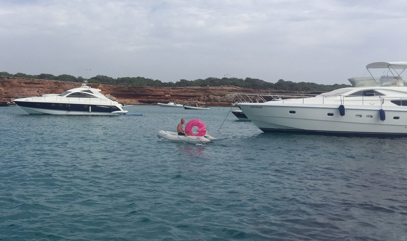 Det var med viss tvekan vi seglade mot partyön Ibiza. Fulla tonåringar var vår bild av ön. Våra fördomar har dock kommit på skam och Ibiza är en riktigt mysig liten ö med flera fina ankringsvikar. Det har inte heller varit lika trångt som på Mallorca. Kanske beror det på att många av båtarna är lokala och går i hamn på kvällen eller på att båtlivet domineras av gigantiska lyxjakter. Vi har ofta varit omgivna av motorbåtar i 50m-klassen med några på 130m. RIB-båtarna är ofta större än vår båt, gärna med två eller tre 200hk-motorer. En del har en mindre jolle (större än vår) hängande bak.