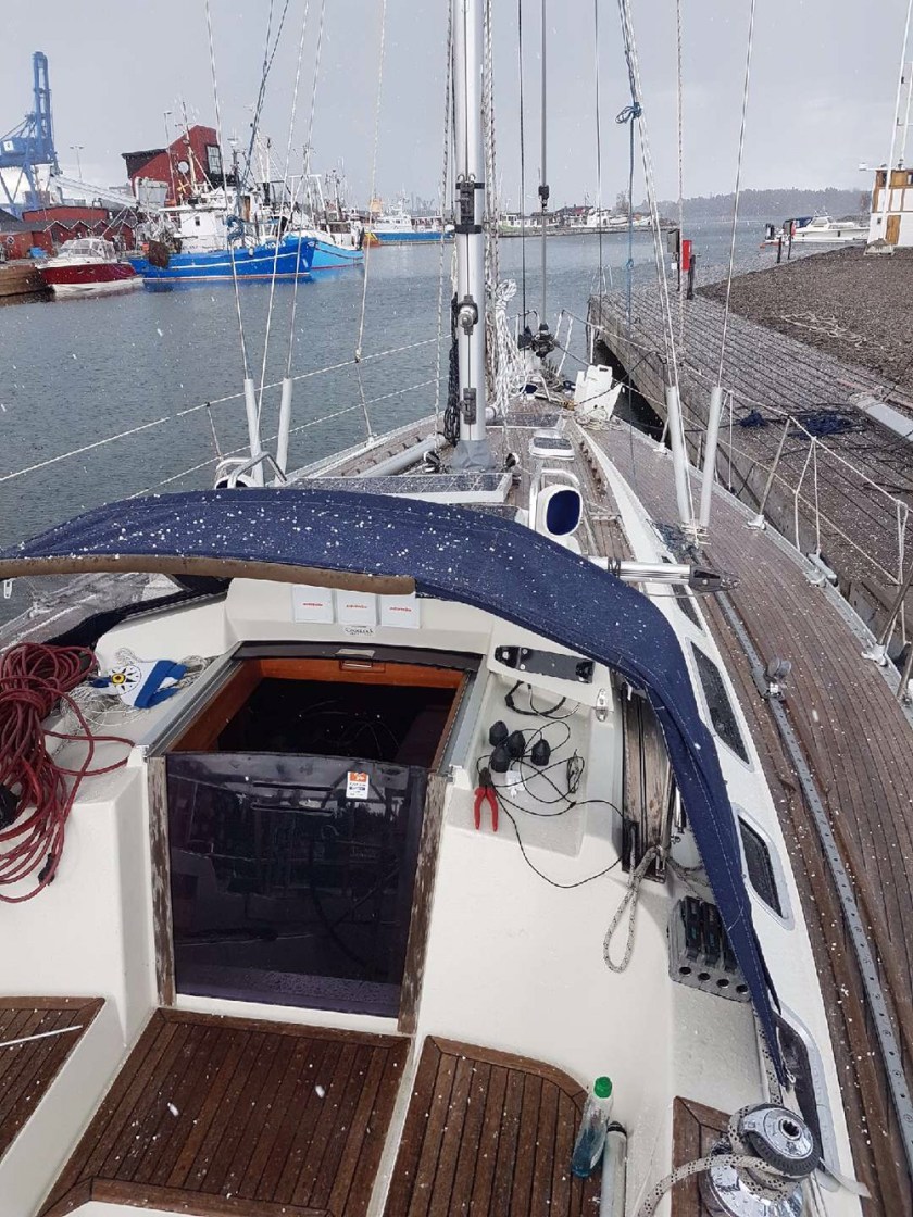 Efter två intensiva veckor i båten har vi nu lämnat Oxelösund och påbörjat vår resa. Veckan har varit kall och blåsig så värmefläkten har gått på max inne i båten.