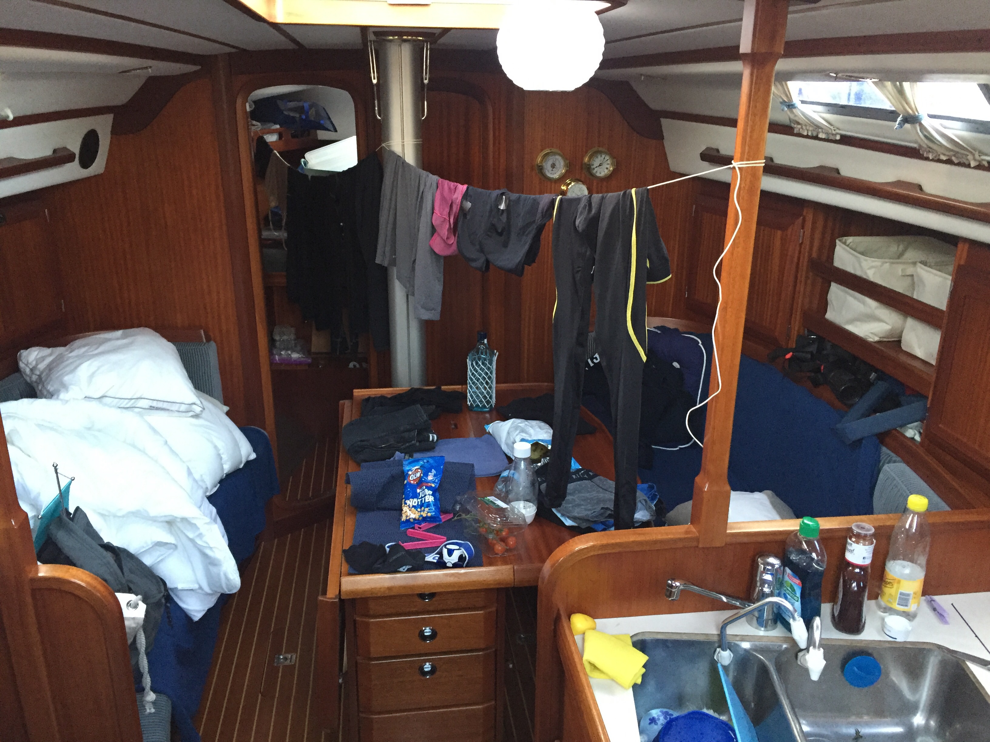 Dags att lasta allt i båten. Vi hyrde ett skåpsläp på Shell och fyllde det ned flyttlådor, segelsäckar, livflotte, jolle och en hel del annat. Det såg ut att vara helt omöjligt att få in allt i båten, men det gick, Det tog fem dagar att få så pass ordning att man inte behöver hoppa över väskor vart man än skall, men nu är det mesta undanstuvat. Varje skrymsle i båten är utnyttjat. En del är ju sådant vi vet att vi inte behöver på några månader, så det packas på svåråtkomliga ställen. Det finns ett skrymsle bakom dieseltanken under Annas koj, där ligger nu alla dieselfilter.